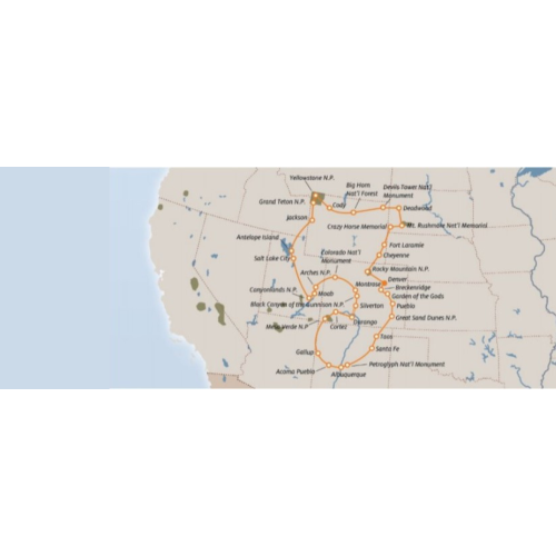 > Ingressi: Crazy Horse Memorial, Mt. Rushmore National Memorial, Devils Tower National Monument, Buffalo Bill Center of the West, Antelope Island, Colorado National Monument, Box Canyon Falls, Petroglyph National Monument, Taos Pueblo, Garden of the Gods e tutti parchi nazionali come descritto nell’itinerario